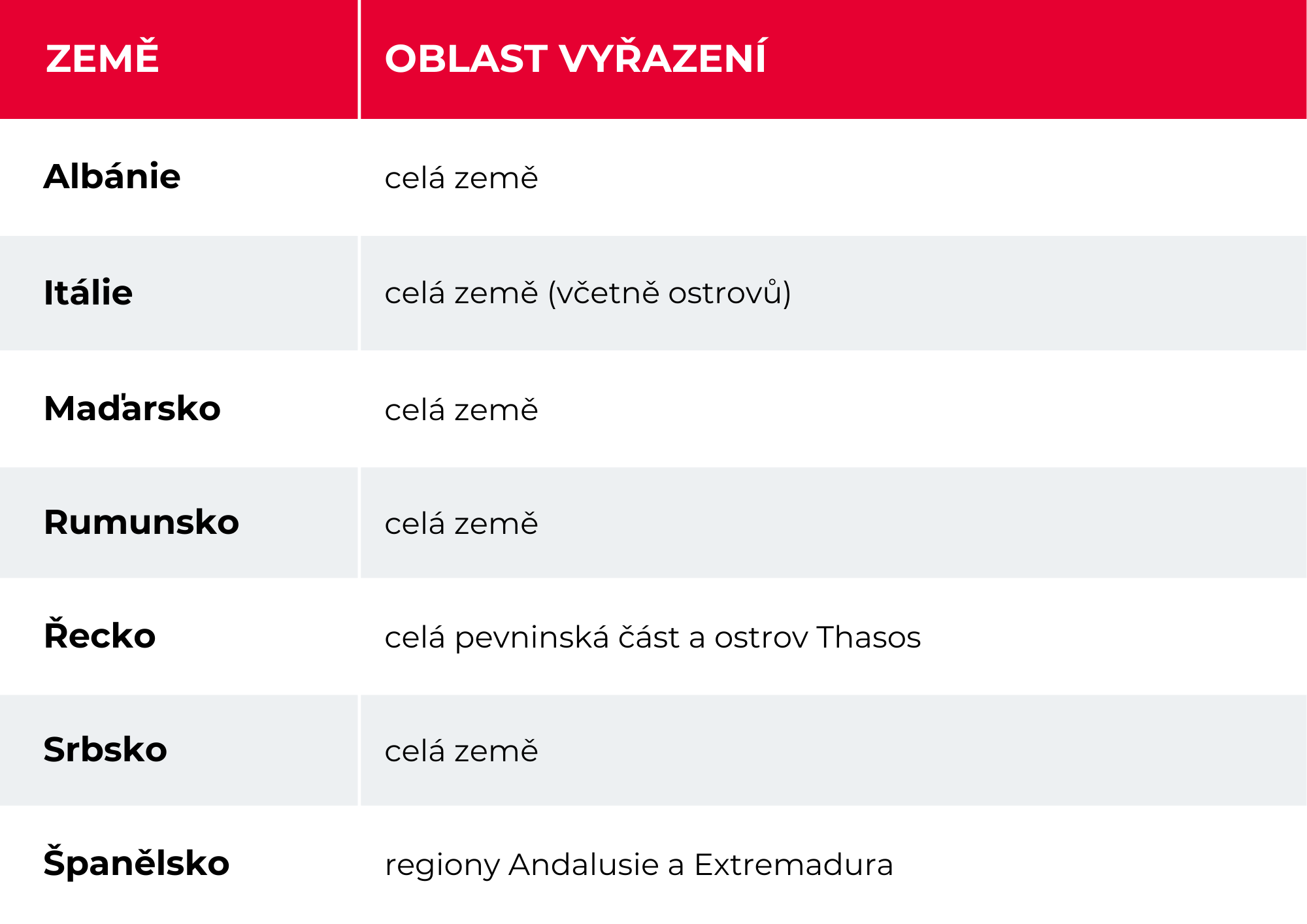 Na dobu 28 dnů budou pro riziko přenosu WNV z dárcovství vyřazení dárci, kteří v období od 1. 5. 2025 do 31. 10. 2025 pobývali (pozn. za pobyt se považuje návštěva zahrnující alespoň 1 přenocování) v následujících zemích nebo oblastech: