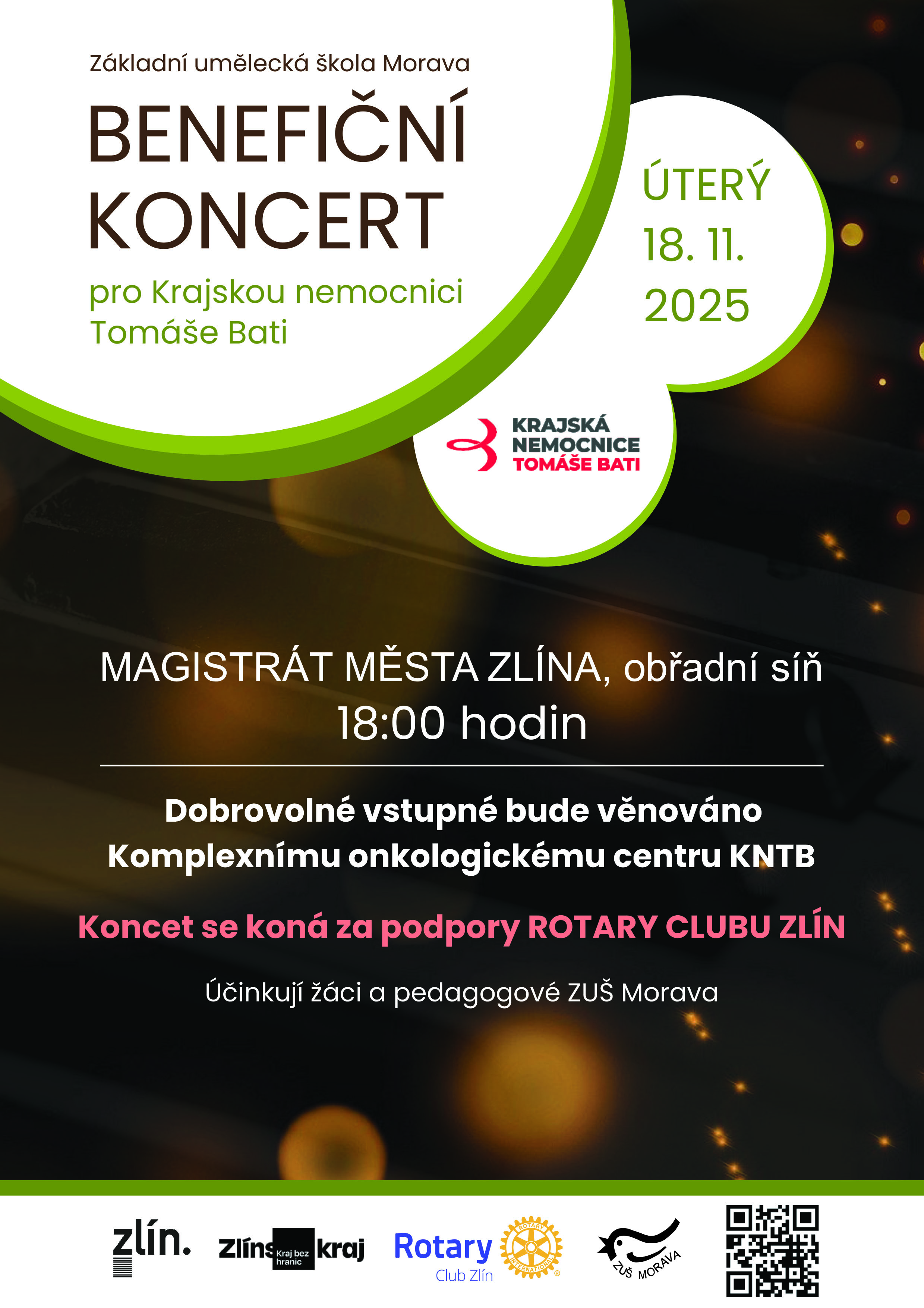 Zveme Vás na benefiční koncert, který připravují studenti a pedagogové Základní umělecké školy Morava. Koná se 18. listopadu v 18 hodin v obřadní síni zlínské radnice. Výtěžek připadne Komplexnímu onkologickému centru KNTB.